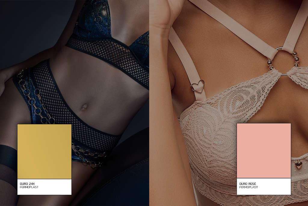 A varidade de banhos Fermoplast garante o destaque em cada uma dessas propostas. Se por um lado a força do dourado transmite poder e sofisticação, por outro, a delicadeza e feminilidade do ouro rosé são o toque a mais em lingeries com pegada romântica.