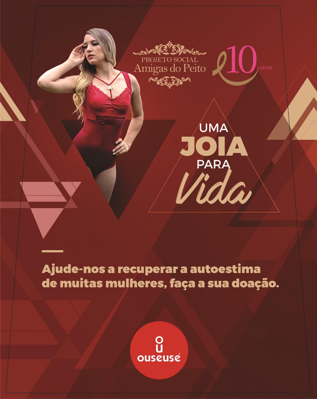 “O pingente banhado a Ouro 24k e com um diamante cravado no centro que foi usado na peça, nos foi entregue pelo nosso fornecedor Fermoplast, em uma de suas campanhas que consistiu na escolha de algumas empresas brasileiras para receber este presente. E nos foi por bem, usar essa peça valiosa em prol de pacientes que lutam contra o câncer!” – Diz a diretora da OuseUse.